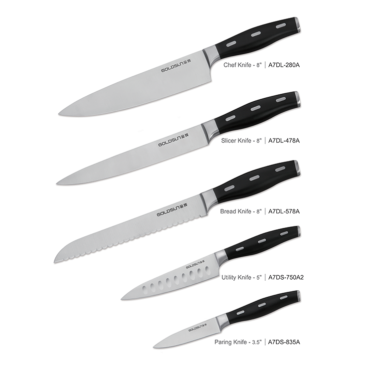- 8' kockkniv, 8' skärkniv, 8'brödkniv, 7' Santoku-kniv, 5' brukskniv, 3,5' skalkniv, 4,5' stekkniv